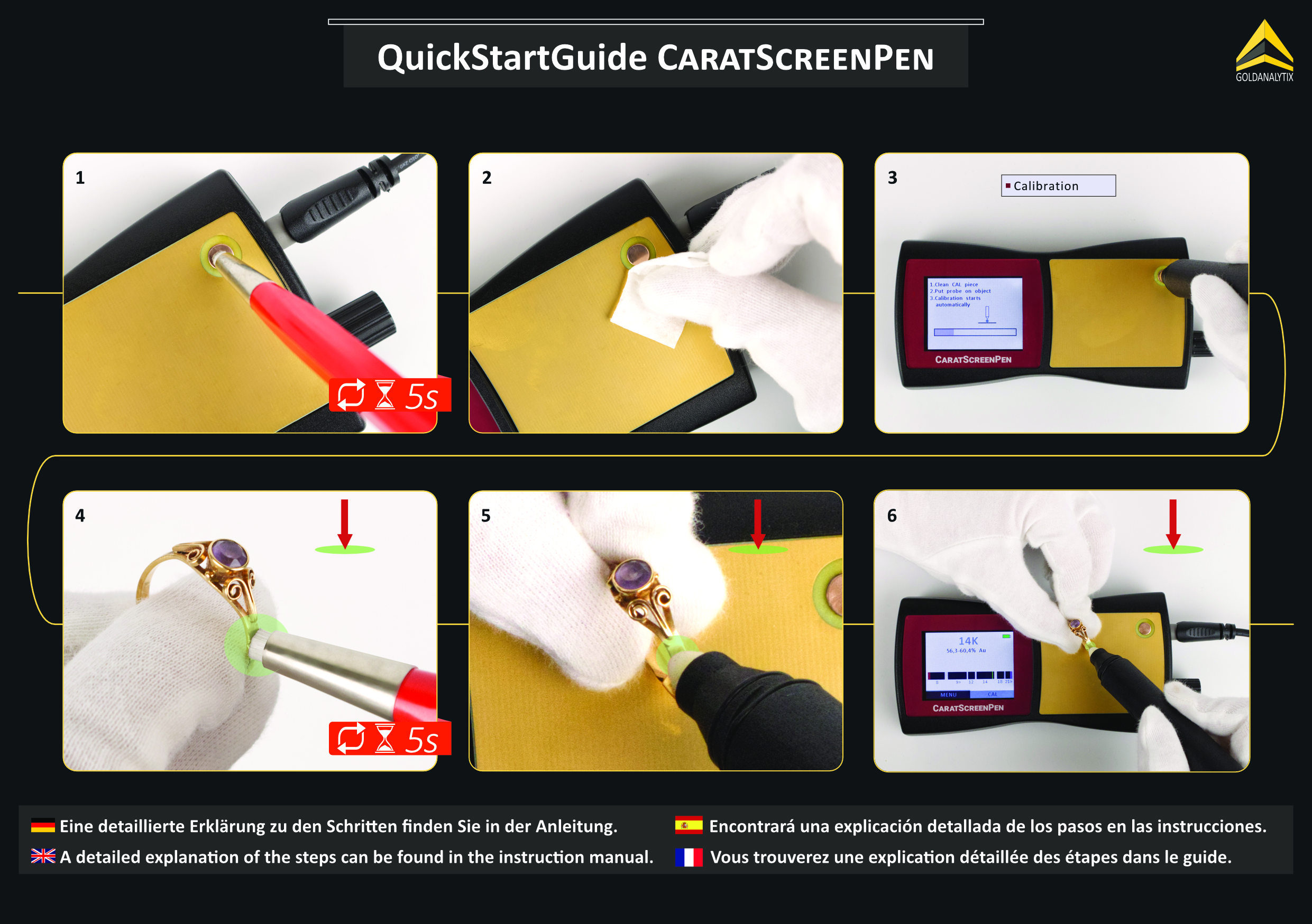 Please note that the CaratScreenPen measures on the surface. It is not possible to penetrate thick gold plating without filing. More details on measurement results and correct interpretation can be found in the detailed operating instructions.